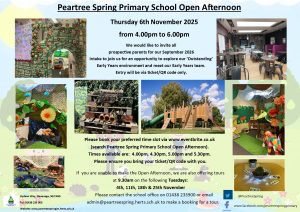 Application process for applying for a Reception place for September 2026 – The application process for applying for a Reception place for September 2026 for children born between 1 September 2021 and 31st August 2022 will be open on Monday 3rd November 2025. All the information you need to apply is available on the Hertfordshire County Council website at www.hertfordshire.gov.uk/admissions. The closing date for applications is Thursday 15th January 2026.
